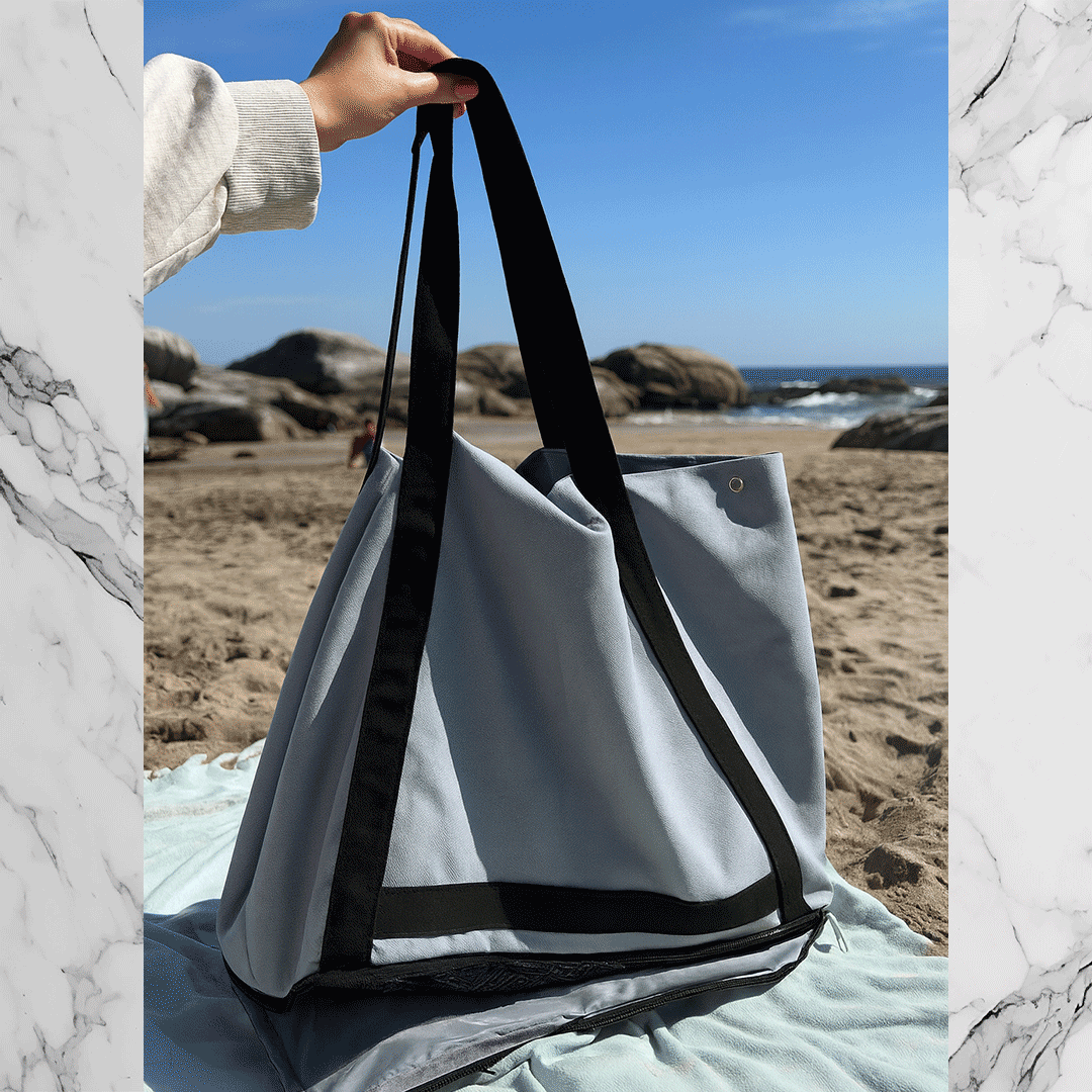 Bolso color gris, hecho en algodón y poliéster. Hebilla magnética en el centro y botones plegables en ambos lados. Contiene un bolsillo oculto con cremallera de nylon negro de 15*15 cm dentro. Hay dos capas en la parte inferior, una es de malla negra y la otra es material de lona. La cremallera inferior se puede sacar para filtrar la arena.