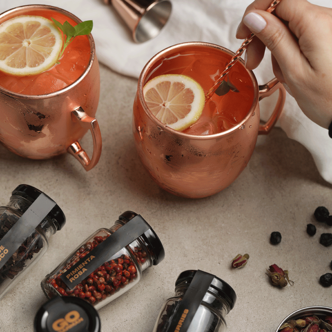 Este set contiene un kit de Gin Tonic con 4 botánicos exclusivos, 2 mugs cobrizados y cuchara revolvedora. Elegancia y funcionalidad para tus cócteles.