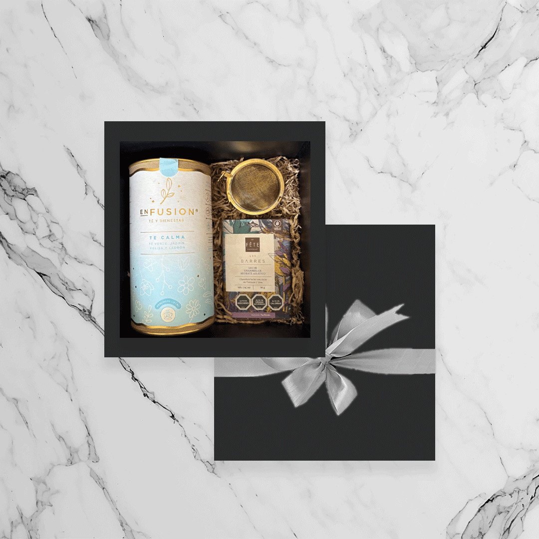 Este Set incluye lata de té «Calma» de Enfusión, un infusor bola color dorado y barra de chocolate La Fête. Un detalle perfecto para acompañar y cuidar.