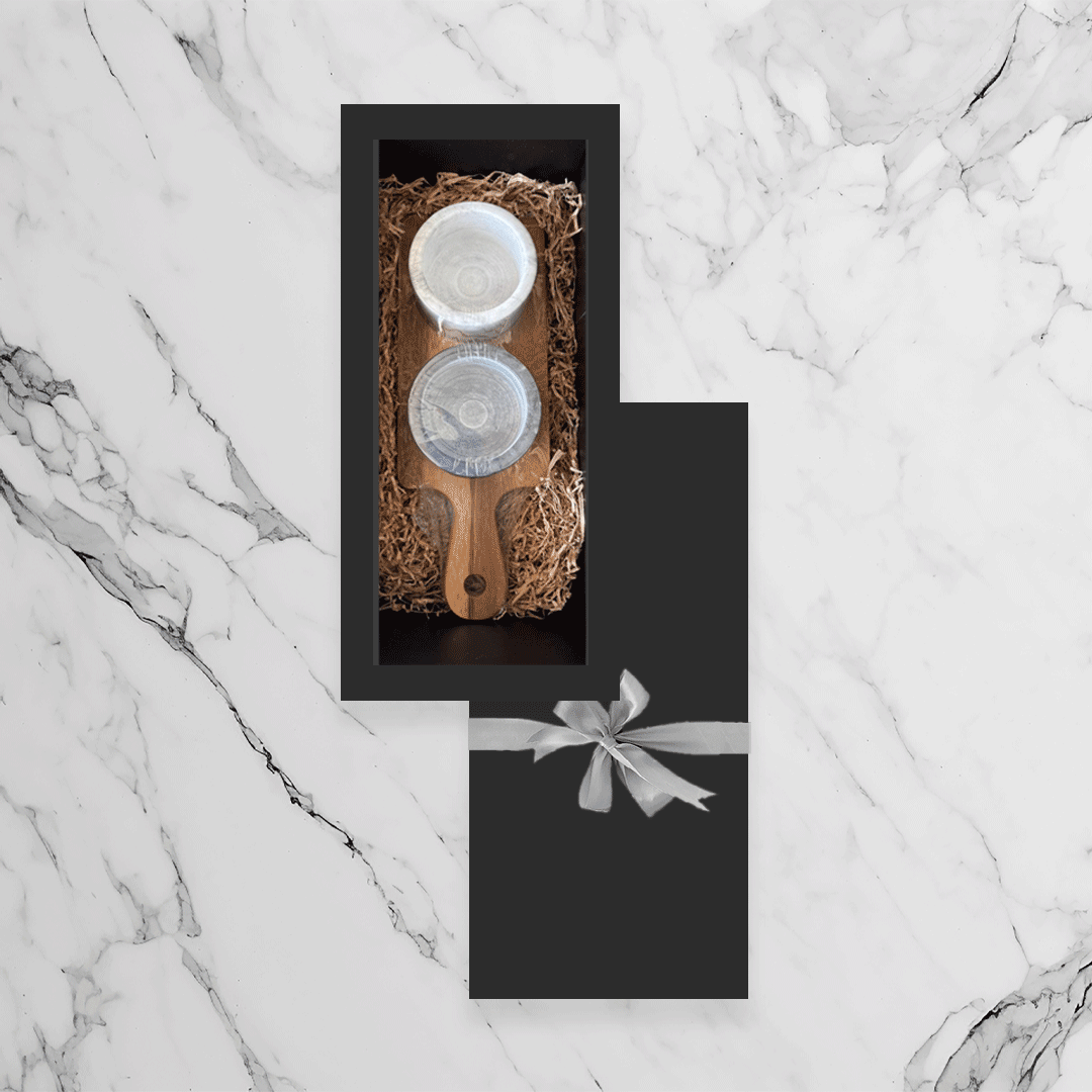 Set de 2 cuencos de mármol blanco y negro con base de madera. Una forma sofisticada de presentar salsas y acompañamientos