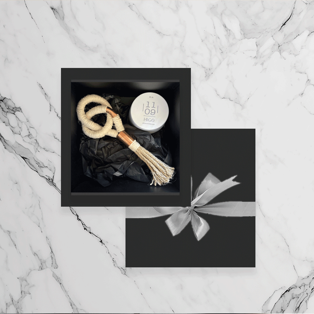 El Set incluye una pieza de arte decorativo «Nudo Embarrilado» hecha de hilos de algodón, cobre, yute y lino junto a una vela en lata 1109 Higo. Un detalle completo para lograr espacios acogedores con una luz cálida y perfumada.