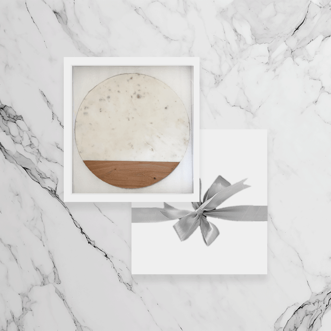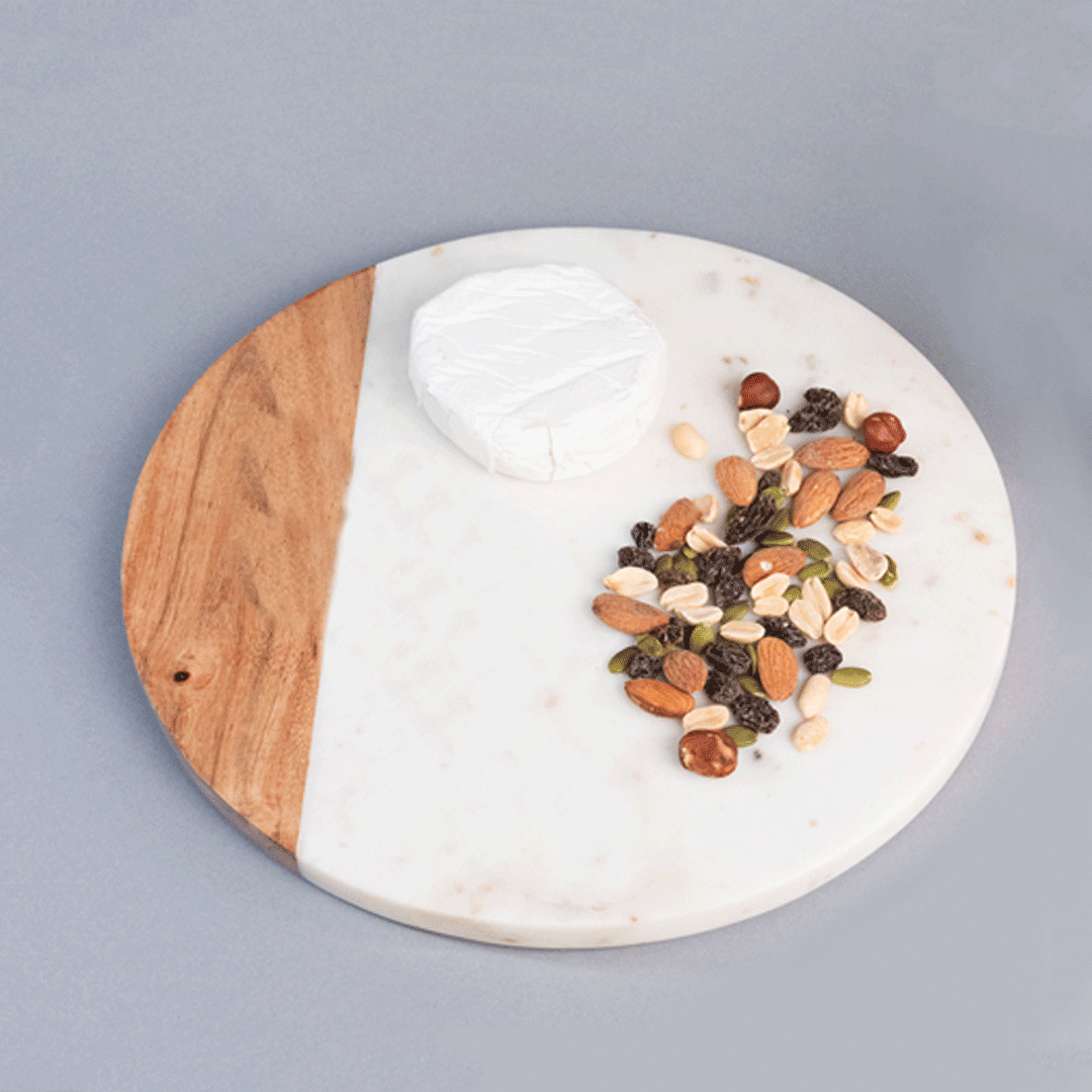 Tabla redonda de mármol blanco y madera (28 cm de diámetro). Elegante y práctica para quesos y aperitivos
